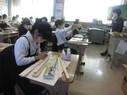 4年生の図工はこれからのこぎりを使います。今日は材料の確認とどんなものを作るか考えました。