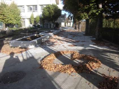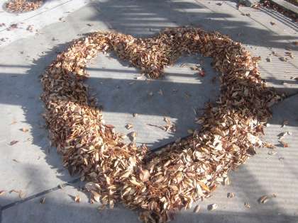 花壇の前にきれいなハートの落ち葉アートが出来上がっていました。子どもたちも先生も気持ちのよい朝を迎えることができました。
