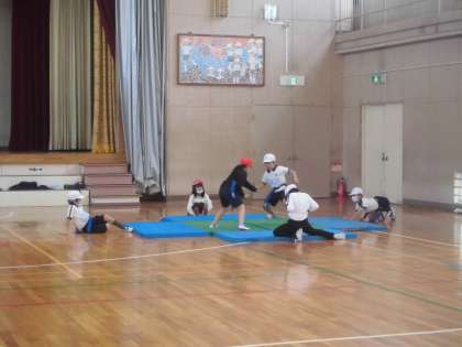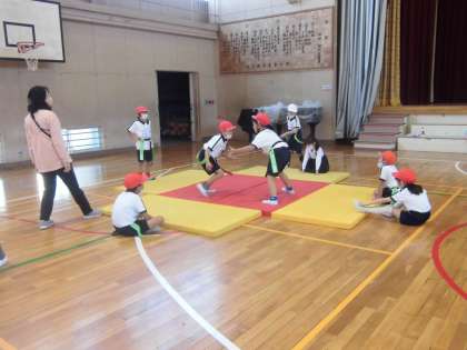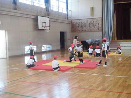 すもうの学習をしました。しっぽ取りの要領で腰のテープを取り合います。楽しそうな声が響いていました。