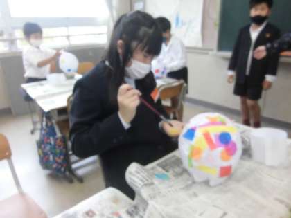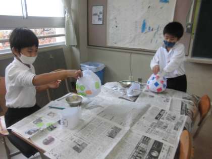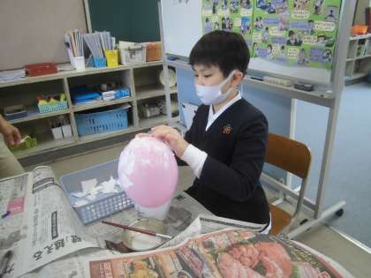 風船でかたどった紙に、模様をつけていました。きれいな形です。もう少しで完成しそうです。