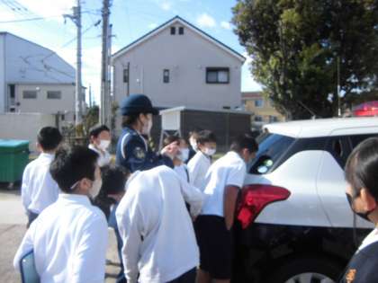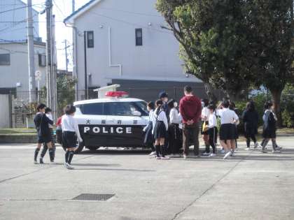 中堺警察の方に来校いただき,自転車の乗り方や交通ルールについて教えてもらったり,質問に答えてもらったりしました。実際に乗ってこられたパトカーも見せていただきました。