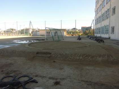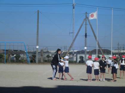 体育では、外ですもうをしていました。先生は裸足になって、子どもたちと対戦していました。立派な土俵にもふれてみました。