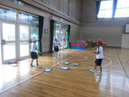 縄跳びでいろいろな跳び方に挑戦しています。二重跳びに挑戦している人もいます。