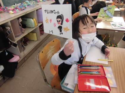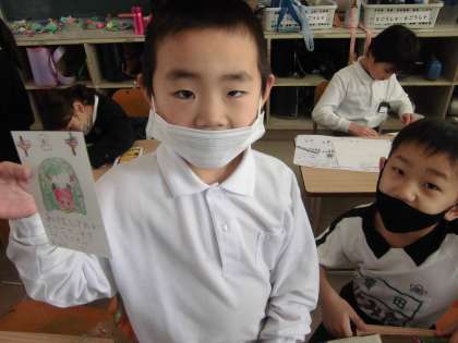 すもう大会に向けて応援の旗を作りました。年賀状を書いている人もいます。みんなの机の上がとてもカラフルです。
