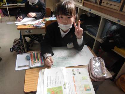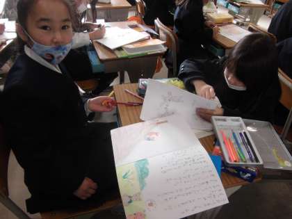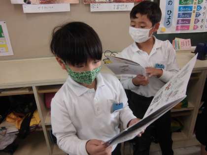 自分たちで考えたお話を絵本にしました。完成した本を見せ合う人もいます。