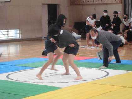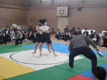 すもう大会の決勝がありました。さすが6年生!とっても迫力があります。中には体格差にひるまずにがんばっている人もいました。1年生も力いっぱい応援していました。