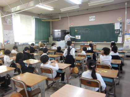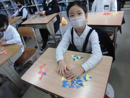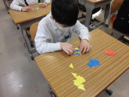 色板を使っていろんな形を作ります。みんなの前で作り方の説明をしました。