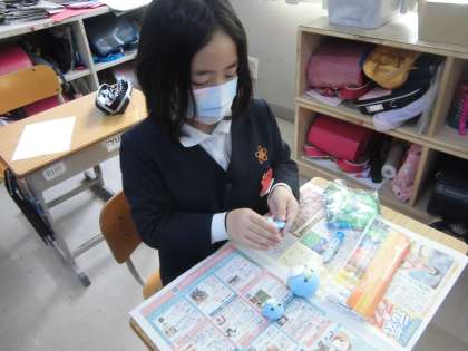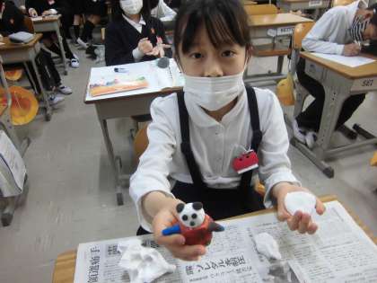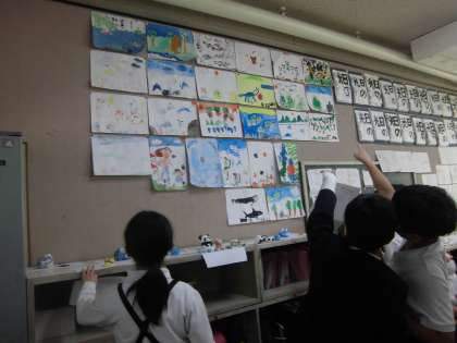 紙粘土に絵の具で色をつけてさまざまな作品を作っています。終わった人たちでみんなの粘土や絵画の作品の鑑賞会を開いていました。
