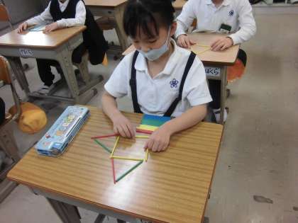 色の棒を使っていろいろな図形を作ります。三角を作るには棒が何本必要なのかなど、楽しみながら図形の要素を学んでいます。