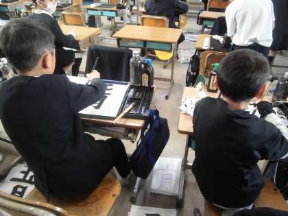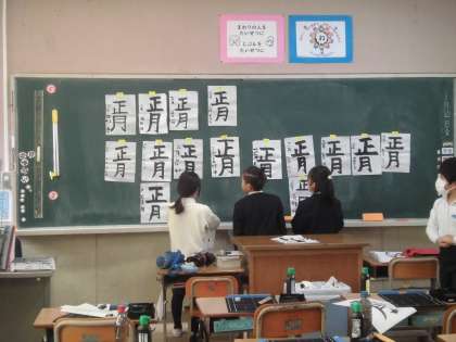 「正月」を書きました。黒板に貼ってみんなの作品を鑑賞します。