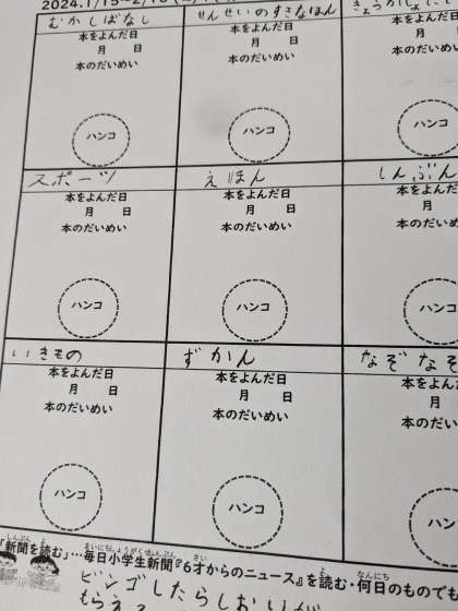 図書委員会の人たちが、図書ビンゴを考えてくれました。いろんなジャンルの本を読んで、マスを塗っていくそうです。今日、さっそく図書の時間があったので、本を借りました。「図鑑って、いっぱいあるから、どれにしようかな。」「この本やったら、どのマスが塗れるかな」など、ビンゴに興味津々。さあ、1か月でマスを塗っていこうね!!