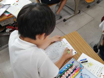 2組は、育てている野菜の観察記録を書いていました。教科書のお手本を見ながら、見つけたことを絵と言葉で上手に表現しています✐