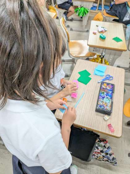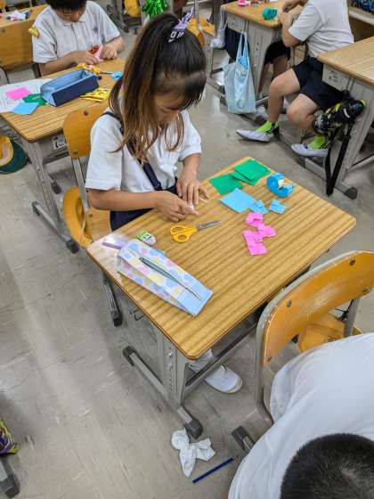 図工の絵で使うあじさいを折り紙で折りました。「難しい!!」と言っていた人も、お友だちに教えてもらったり、何個も折っていくと慣れてきたりしていました。折り紙のミニ先生もたくさん発見!!いよいよ、絵も完成です!!