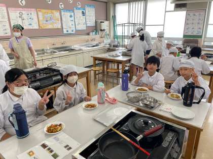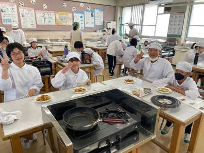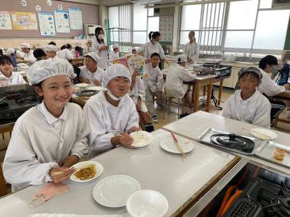 包丁やコンロの火にドキドキしながらも、班で力を合わせて作りました!協力して出来た焼きそば、美味しかったよ?
