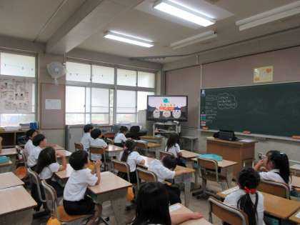1組は生活科。あさがおの成長の観察のビデオを見ました。