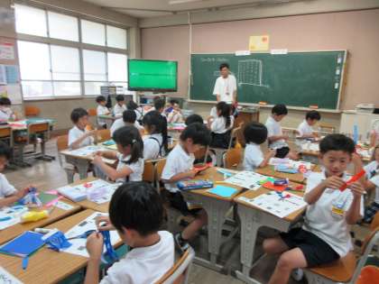 2組は図工。七夕の笹飾りを作りました。