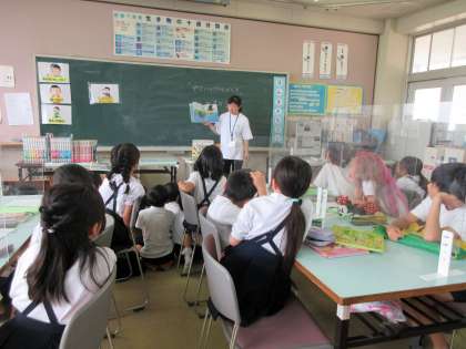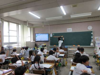 2組は図書。「やさいのプールびらき」。今日からプールが始まった福田小学校にぴったりの絵本ですね!