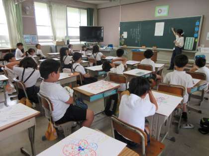 3組は図工。この前描いた大きなお花に今度は茎をのばしていきます!