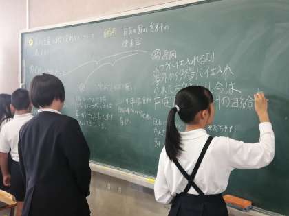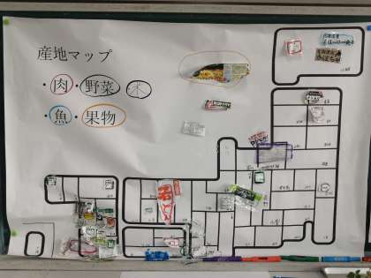 2組は社会。産地マップを見て気づいたことを、黒板に書いて意見交流です。
