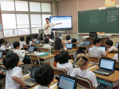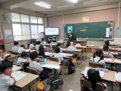 1組は算数。「どちらがいくつ多い?」みんなで考えています。