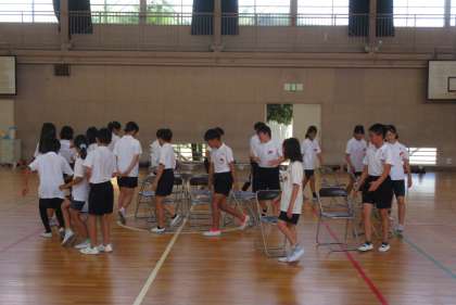 3組は、体育館でお楽しみ会中♪ みんなで輪になり、いすとりゲームです。最後まで残るのは誰かな?