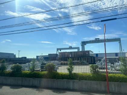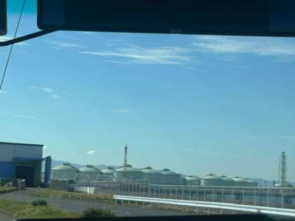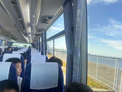 堺・泉北臨海工業地帯に来ました。車窓から見学します。「どうして工場は海のそばにあるんだろう?」「どうして工場がまとまってあるのかな?」みんなで考えます。