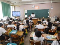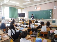 1組は社会です。堺市の良さについて班ごとにプレゼンテーションをしています。上手に...