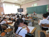 1組は算数のテスト中。終わった児童もたくさんいました。2組は3年生とすもうの取り...