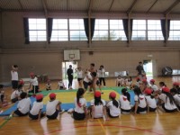 福田小学校恒例のすもう場所に向けて、体育館で、6年生が1年生にまわしの回し方や、...