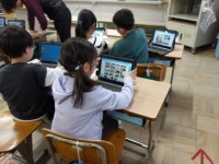 冬休みに行った手伝いの様子を写真に撮り,みんなで共有します。タブレットの扱いにも...