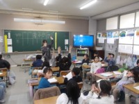1日の流れをカードを使いながら英語で説明しています。隣同士で協力しながら活動して...