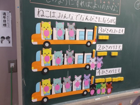 実習生が1年3組で授業をしていました。3+2+4の計算に取り組んでいました。かわいいねこがたくさん並んでいますね。