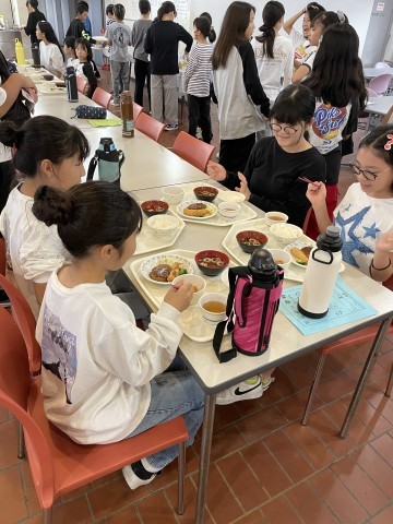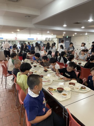 お楽しみの夕食でした。ハンバーグやエビフライはとても美味しかったです。おかわりをたくさんする子もいました。