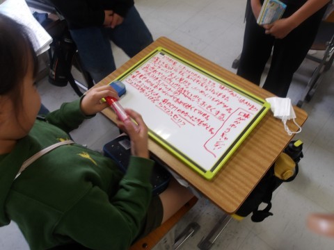 自分たちでつくったCMを作り直しています。6年生からもらったアンケートをもとに自分たちのCMの改善点を話し合っています。