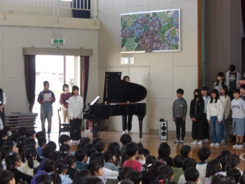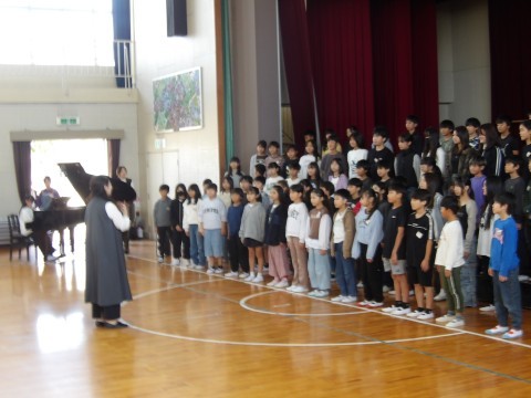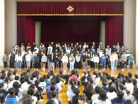 今週の連音にむけて壮行会を行いました。5年生がとてもきれいな歌声を披露してくれました。5年生の皆さん,本番でも心を一つにしてがんばって下さいね!