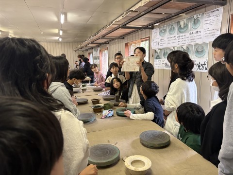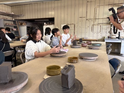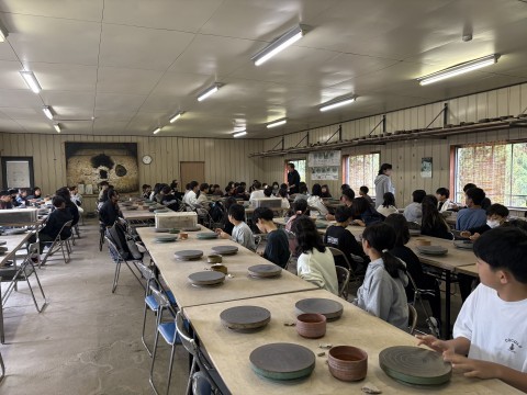 宗陶苑の方のお話を聞き、陶芸体験スタートです!
