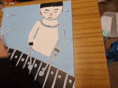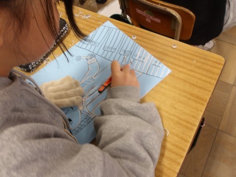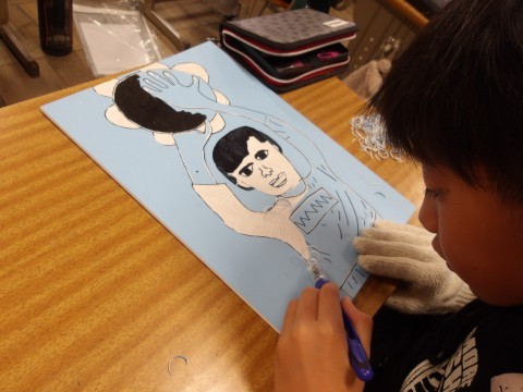 版画の様子です。スポーツをしている姿や楽器を演奏している姿を彫っています。