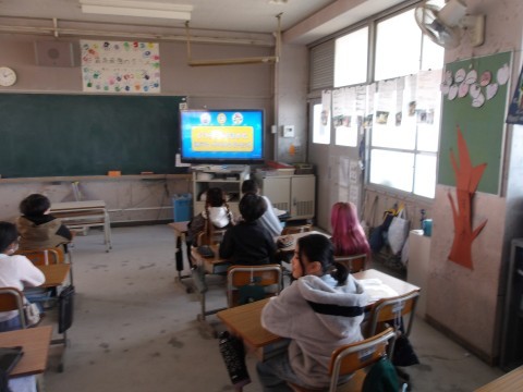 交通安全教室を行いました。本日1年生は運動場で歩行訓練を予定していましたが,中止となりました。DVDで交通ルールについて学んでいます。