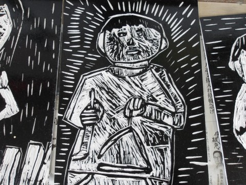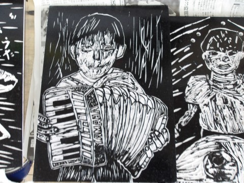 楽器を演奏している姿を版画にしました。細かいところまで丁寧に彫れていますね。