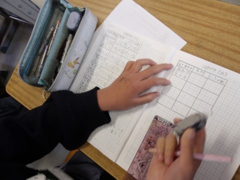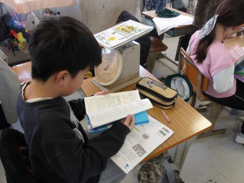 量りを使って重さをはかっています。筆箱やランドセルなど,自分の身の回りの物をはかって量感を養っていきます。