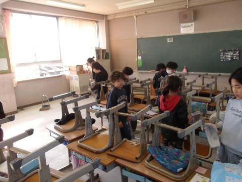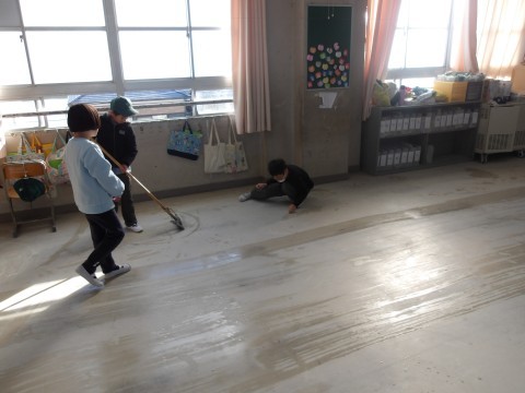 大掃除です。いつもより丁寧に掃除していますね。椅子の裏のほこりをとったり,床を水拭きしたりしています。協力して活動できていますね。