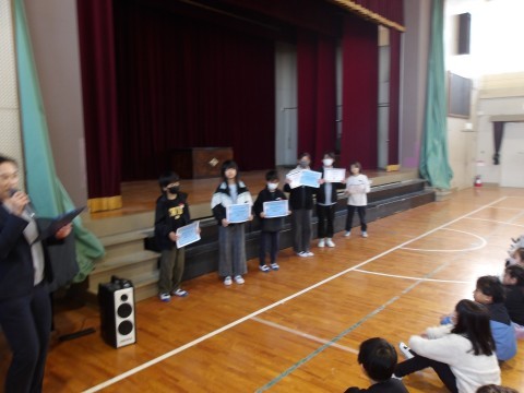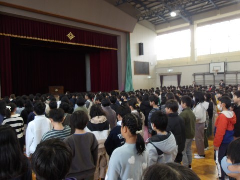 始業式です。今日は全員が体育館に集合して実施することができました。校長先生から残り少ない3学期の日数を大切に過ごすよう話がありました。東区小学生絵画展・算数クラスマッチの表彰もありました。