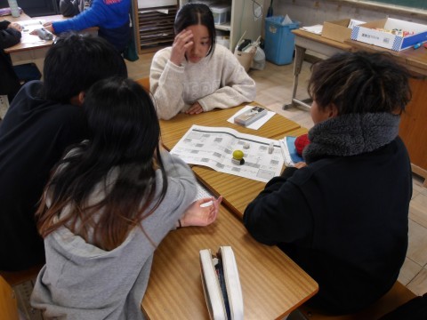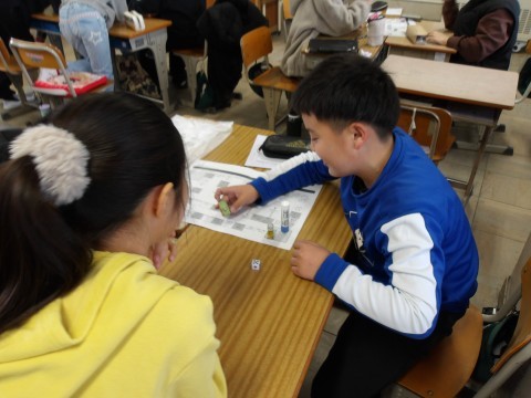1・2組は冬休みの思い出をすごろく形式で交流していました。3組は教室で合唱の練習をしていました。