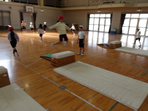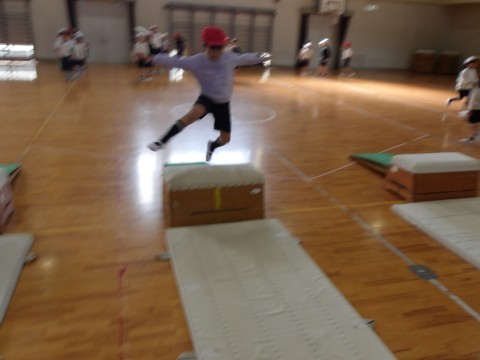 跳び箱遊びです。うまく跳び箱の踏切ができるように練習していました。