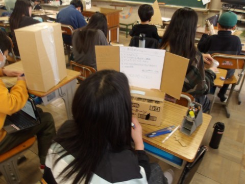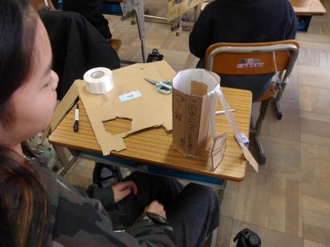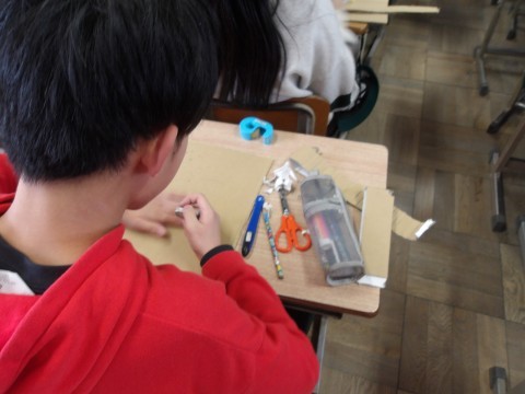 明日の参観の看板づくりです。段ボールで一人ひとり工夫を凝らしていました。