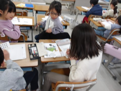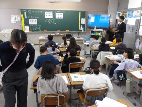 8個のチョコレートの1/2にするには何個になるでしょう。この単元で2年生は分数についてはじめて学びます。子どもたちは実際に手を動かしながら学習しています。