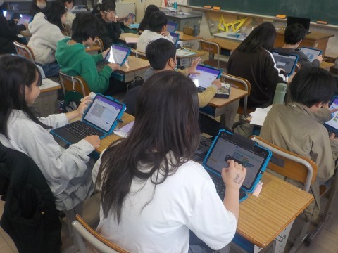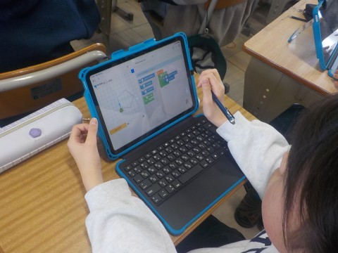 プログラミングを用いて図形を作成していました。失敗を修正しながら取り組んでいました。