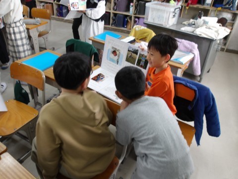 2年生は生活の授業をしていました。自分たちで作った成長記録を見せ合ったり、お友だちの良いところを書き合ったり、とても楽しそうに学び合っていました。