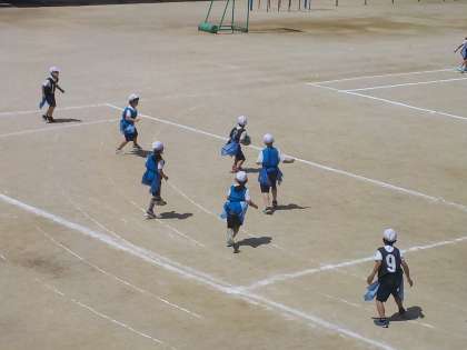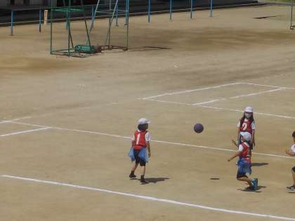 体育でタグを使ったボールパスゲームをしています。相手に捕まらずにうまくパスをしています。