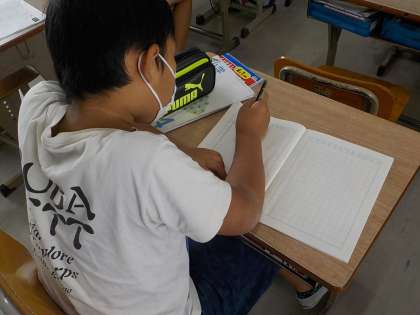 少人数で算数をしています。長さや重さの単位の学習をしています。